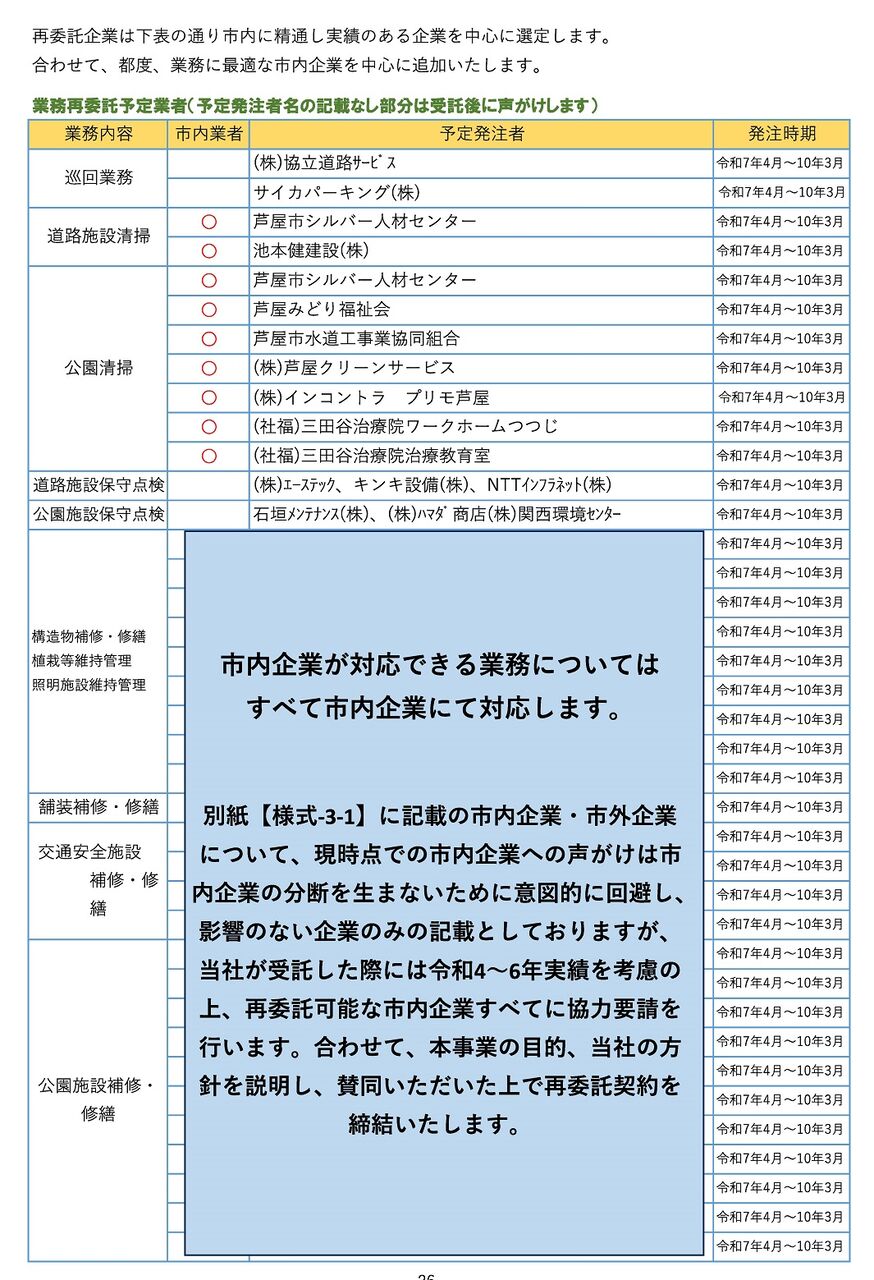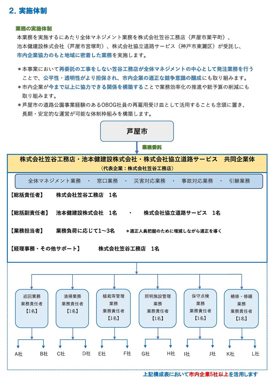 笠谷工務店の企画書を見る限り、実施体制上の12社。および業務再委託予定業者については空白です。受託後に協力要請を求め、賛同してくれた企業と再委託契約を結ぶとされています。とりわけ、街路樹の維持管理については街路樹剪定士という資格が必要となります。いわば職人技術。ここについては市内事業者の協力を求める必要がありますが、そこが今回競合した相手なんですね。
